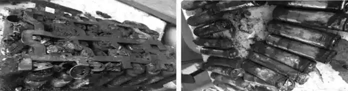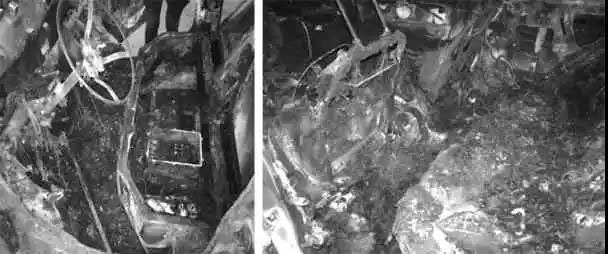 經(jīng)查該車GPS監(jiān)控?cái)?shù)據(jù),車輛在早晨4點(diǎn)左右電池單體溫度開始上升,至5點(diǎn),單體溫度升至126℃,之后無(wú)數(shù)據(jù)上傳,未發(fā)現(xiàn)外部火源存在。對(duì)車輛進(jìn)行勘查,無(wú)線束短路點(diǎn)存在。動(dòng)力電池拆解,熔斷器正常,排除外部電路短路引起電池包失效的可能性,內(nèi)部低壓線束破損(圖4)。