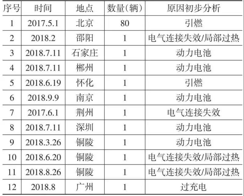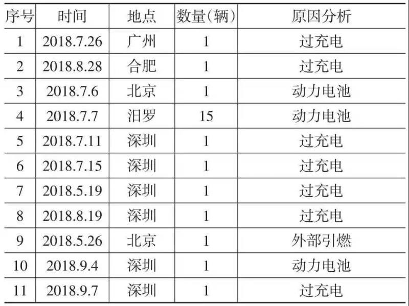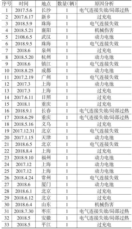 根據(jù)媒體公開報(bào)道和業(yè)內(nèi)人士資料提供(企業(yè)和車型信息不再顯示),2017年至2018年底的不完全統(tǒng)計(jì),國(guó)內(nèi)共發(fā)生新能源汽車安全事故超過59起、涉及汽車超過153輛(見下表)。