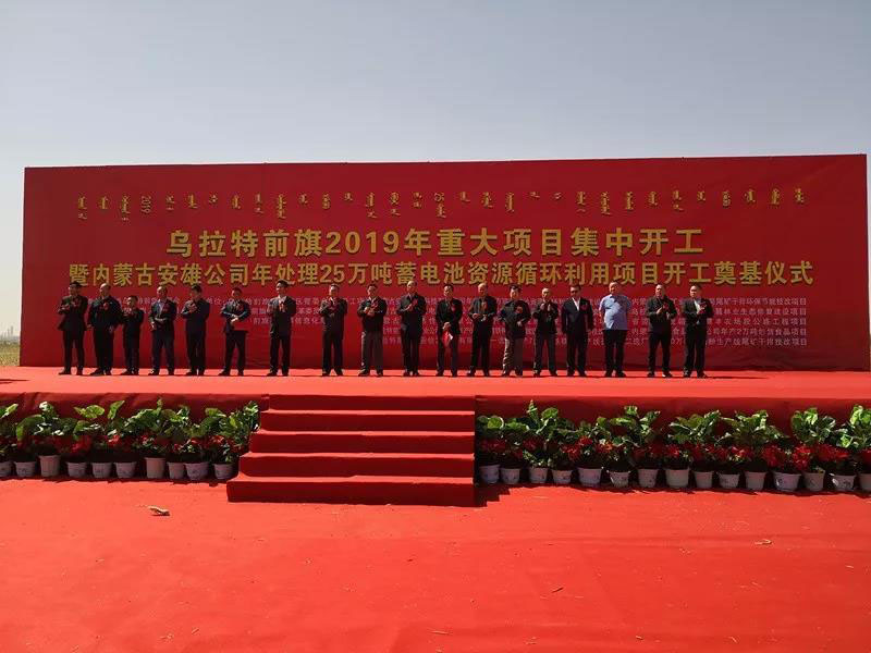 5月15日,巴彥淖爾市烏拉特前旗2019年重大項(xiàng)目集中開工暨內(nèi)蒙古安雄環(huán)??萍加邢薰灸晏幚?5萬噸蓄電池資源循環(huán)利用基地項(xiàng)目奠基儀式在烏拉特前旗工業(yè)園區(qū)隆重舉行。