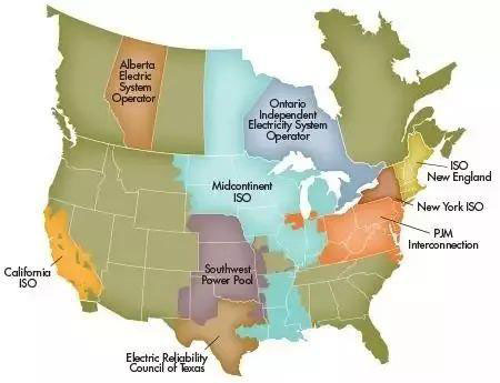 北美9大區(qū)域電力市場(chǎng)示意圖。加拿大中部安大略與阿爾伯塔等省,與美國電力市場(chǎng)聯(lián)系比和國內(nèi)更為緊密。