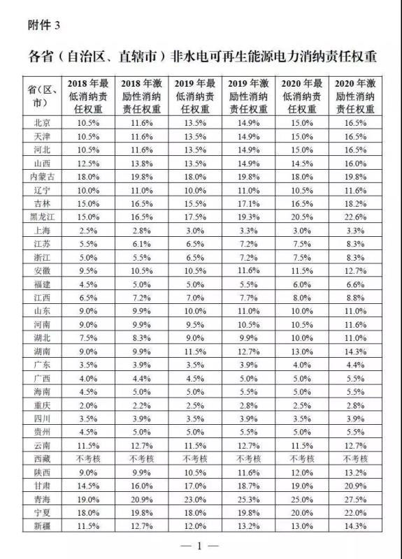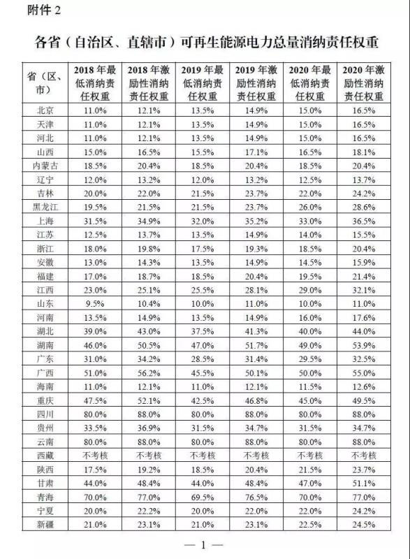 《通知》核心是確定各省級區(qū)域的可再生能源電量在電力消費(fèi)中的占比目標(biāo),即“可再生能源電力消納責(zé)任權(quán)重”。對于有些發(fā)展可再生能源不太積極的省份,通過消納責(zé)任權(quán)重施加了一定的壓力,目的是促使各省級區(qū)域優(yōu)先消納可再生能源,加快解決棄水棄風(fēng)棄光問題,同時(shí)促使各類市場主體公平承擔(dān)消納責(zé)任,形成可再生能源電力消費(fèi)引領(lǐng)的長效發(fā)展機(jī)制。