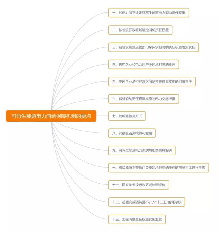 可再生能源消納保障機(jī)制的主要實(shí)施機(jī)制可簡單歸納為:①、按省級行政區(qū)域?qū)﹄娏οM(fèi)規(guī)定應(yīng)達(dá)到的可再生能源消納責(zé)任權(quán)重,②、同時(shí)由各省人民政府能源主管部分負(fù)責(zé)對本省行政區(qū)域的消納責(zé)任權(quán)重落實(shí),③、最后由國務(wù)院能源主管部門對各省行政區(qū)消納責(zé)任權(quán)重完成情況進(jìn)行檢測評價(jià)。