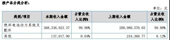 從產(chǎn)品銷售情況來看,報(bào)告期內(nèi),億華通燃料電池動力系統(tǒng)及配件收入占比達(dá)99..96%,是主要收入來源。