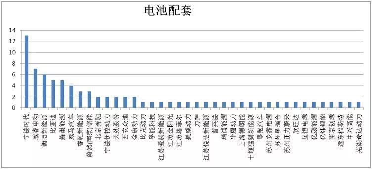 38家企業(yè)為本批64款新能源乘用車提供電池配套,分布極為零散并呈現(xiàn)兩極分化,排名前5企業(yè)配套了40款乘用車型,還有25款電池企業(yè)僅僅配套了一款車型。