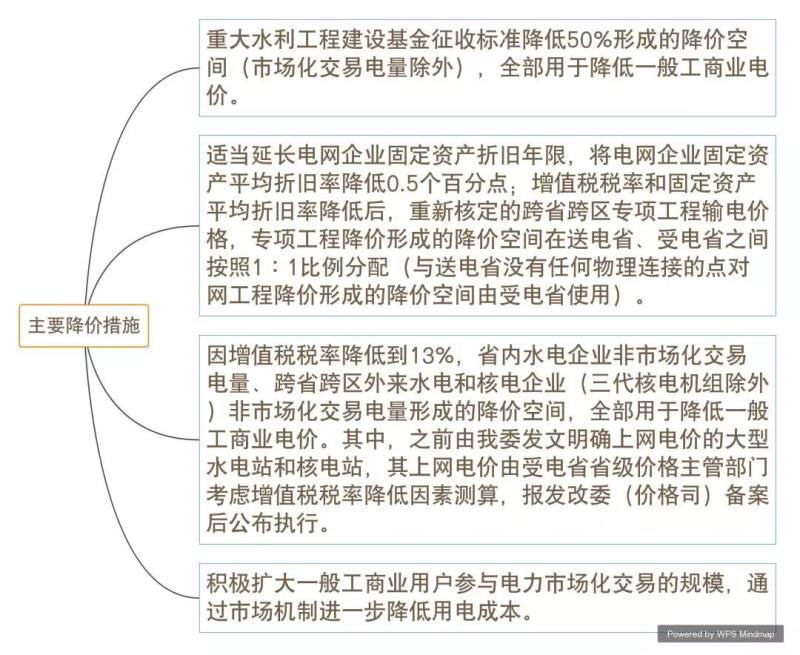 因增值稅稅率降低到 13%,省內水電企業(yè)非市場化交易電量、跨省跨區(qū)外來水電和核電企業(yè)(三代核電機組除外)非市場化交易電量形成的降價空間,全部用于降低一般工商業(yè)電價。