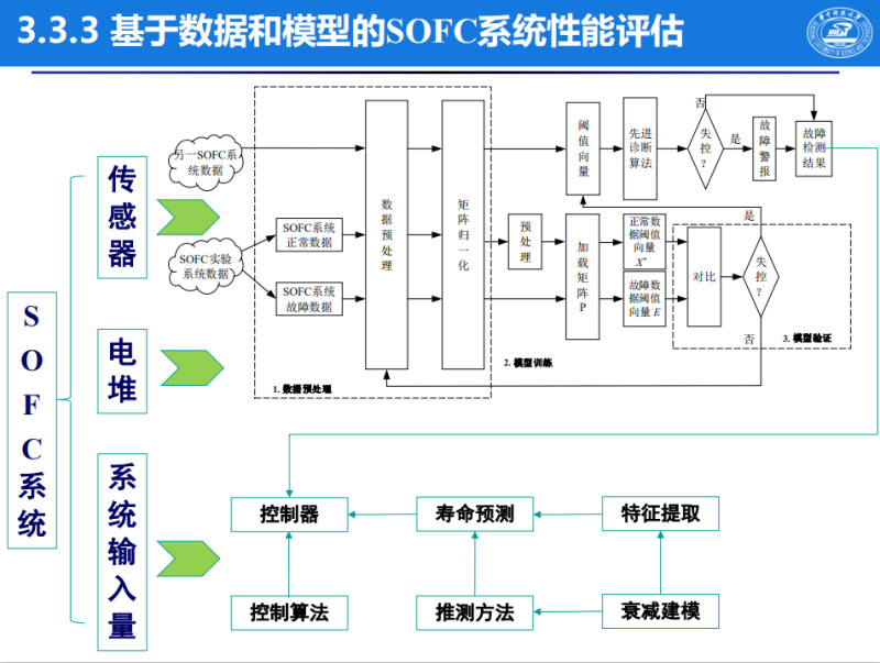 具體怎么分析,怎么評估和做出相應(yīng)的診斷?下面我介紹一下這一塊所開展的工作。對一個(gè)系統(tǒng)級(jí)固體氧化物燃料電池發(fā)電系統(tǒng),這是它的結(jié)構(gòu)示意圖,一般分高溫區(qū)和低溫區(qū)。高溫區(qū)包括電堆、燃燒室、重整、換熱,低溫區(qū)一般包括有電控單元、傳感、儀表和風(fēng)機(jī)等。低溫區(qū)故障相對容易處理。高溫區(qū)處于600℃以上的環(huán)境,每一部件性能稍有損傷都會(huì)影響到整個(gè)系統(tǒng)品質(zhì)。針對高溫區(qū)部件具體所面臨的各類的問題,比如性能是怎么衰減的、怎么規(guī)避、怎么延緩、怎么控制?我們主要圍繞了四個(gè)關(guān)鍵性容易發(fā)生故障的部件單元進(jìn)行分析——電堆、重整、換熱和燃燒?;诖罅肯到y(tǒng)發(fā)電測試分析,在上述冷區(qū)與熱區(qū)這幾個(gè)關(guān)鍵部分,針對其從正常工作到異常工作性能逐步衰減、發(fā)生故障的全過程,通過機(jī)理模型分析和數(shù)據(jù)驅(qū)動(dòng)建立了含各部件特性演變的模型。把正常、異常乃至故障的數(shù)據(jù)盡可能地和我們所搭建的模型去匹配,結(jié)果顯示模型分析預(yù)測結(jié)果與所建立的樣本數(shù)據(jù)還是比較接近的?;谠撓盗谢容^高的模型,才得以開展下面的評估診斷和控制。