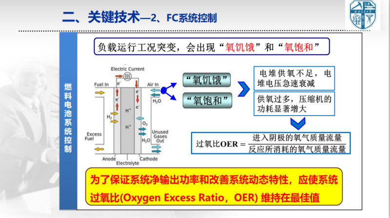 第二個關(guān)鍵技術(shù),就是燃料電池系統(tǒng)控制。大家知道,豐田的大巴和乘用車,混合動力系統(tǒng)拓?fù)浜涂刂贫际遣灰粯拥?,就是因為兩者工況不一樣。軌道交通的工況,完全不同于汽車,在數(shù)秒內(nèi)會出現(xiàn)上千安的電流波動,即使有儲能來跟蹤負(fù)荷變化,但母線電壓仍然會出現(xiàn)劇烈波動,對燃料電池的影響是非常大的。因此,軌道交通燃料電池系統(tǒng)控制,非常重要。對此,我們有十年左右的研究。燃料電池系統(tǒng)控制,主要關(guān)注四個控制目標(biāo),那就是滿足負(fù)載功率的需求、提高效率、延長壽命,在許可的情況下盡量提高它的響應(yīng)速度。影響這四大目標(biāo)的影響因素,包括溫度、壓力、濕度、還有氣體和汽液的動態(tài)時空分布。結(jié)合軌道交通工況,怎么樣開展燃料系統(tǒng)的控制,使得上面的多物理場多時空尺度的均衡分布,滿足四大目標(biāo)的實現(xiàn),這是我們關(guān)心的問題。