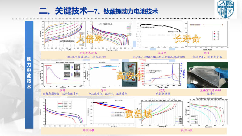 對此,我們針對軌道交通,開展燃料電池系統(tǒng),還有能量管理控制器的研制。不同于汽車,為降低成本,控制器都是基于單片機,而軌道交通,更關(guān)注可靠性,因此我們基于PLC進行開發(fā)。另外就是動力電池方面,儲能方面,因為軌道交通對于安全的要求是非常高的。大家也知道,7.23事故,影響非常大。安全對軌道交通來說是壓倒一切,所以我們不會考慮在軌道交通上面使用三元甚至磷酸鐵鋰。目前我們只選擇鈦酸鋰電池,主要是基于它的安全性。聯(lián)合一些電池的生產(chǎn)廠家,做一些專門針對軌道交通的儲能系統(tǒng)研發(fā)。我們主要關(guān)注大倍率,因為軌道交通數(shù)秒有上千安的電流變化,所以必須大倍率。這個火車,可能從南開到北,一年四季,氣候變化非常大,也要求具有很好的溫度適用性。電芯是跟四川國創(chuàng)成來合作,我們學(xué)校主要做四大管理,就是熱管理、均衡管理、安全管理和壽命管理。