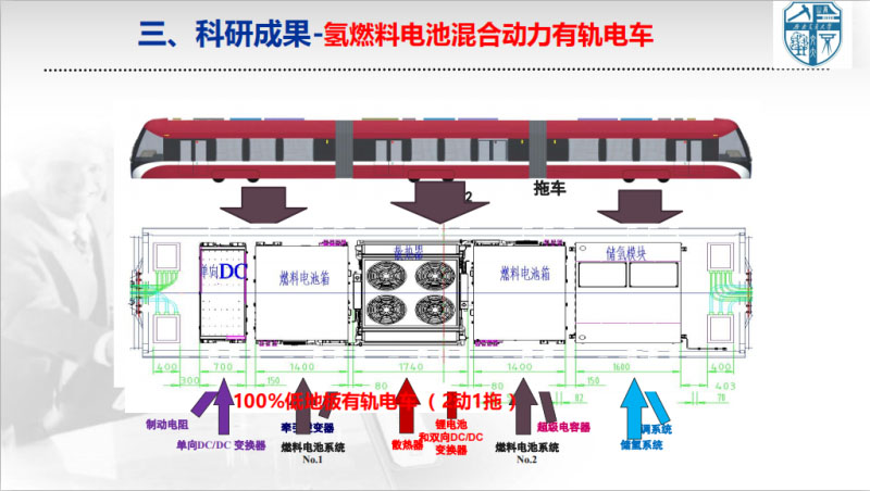 下面匯報一下我們的研究成果。我們主要針對燃料電池、動力電池在軌道交通方面的工作。我們的項目,從國家到部級到省級,都是燃料電池和軌道交通方面相關(guān)的。這是2013年我們團隊研制的國內(nèi)首輛燃料電池電動調(diào)車機車,采用的是地鐵實際在用的調(diào)車。這個就是2016年4月份做的一個燃料電池混合動力的有軌電車。上面這是樣車研制時候的樣子?,F(xiàn)在這個車放在唐山,就是下面這個圖,刷成紅色了,想作為唐山的工業(yè)旅游線路的交通工具?,F(xiàn)在這個車準(zhǔn)備再開展為期兩年的運行。一直在做這種試驗測試工作。這是當(dāng)時我們這個車儲能還有燃料電池系統(tǒng)的布局。這是當(dāng)時這個車出來的時候的視頻。