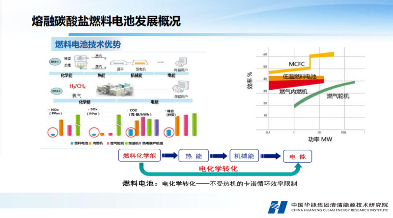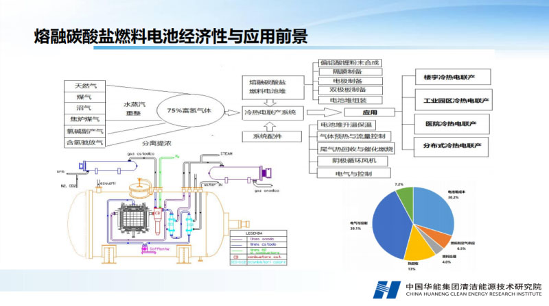 熔融碳酸鹽燃料電池的應用場景方面主要用來發(fā)電,百兆瓦級的大型電站可以用來并網(wǎng)發(fā)電。熔融碳酸鹽燃料電池另外一個優(yōu)點可以進行二氧化碳的補給、濃縮。另外,可以跟可再生能源結合起來實行調(diào)峰制氫和供熱的功能。