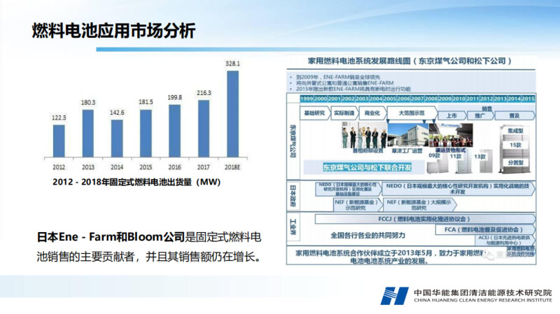 下面我講一下燃料電池的應用市場分析。談到能源革命首先是消費和生產(chǎn)。能源革命首先需要技術的支持,我們需要合適的產(chǎn)品,才能進行消費的革命。分析一下2012-2018年國外的固定發(fā)電燃料電池市場,固定式發(fā)電燃料電池銷量保持持續(xù)增長。固體氧化物占了很大的比例,已經(jīng)超過了熔融碳酸鹽的比例。為什么?因為國外有日本的ene-Farm計劃和美國Bloom energy公司的推動。首先看日本的ENE-farm計劃,固體氧化物燃料電池家用熱電聯(lián)產(chǎn)系統(tǒng)的價格是大幅度下降的。單個系統(tǒng)功率700瓦的家用系統(tǒng)2005年的價格是40萬人民幣,成本非常高。到目前推廣銷售了25萬臺,價格降低到了8萬人民幣。它的最終目標是要降到三萬元每臺。日本的ENE-Farm計劃通過產(chǎn)業(yè)化,降低成本是非常迅速的,成本降低了90%。這就說明燃料電池只有產(chǎn)業(yè)化和示范應用才能降低它的成本。另外,固體氧化物燃料電池在歐洲和德國也進行了示范應用銷售了1500套,基本采用的是日本的技術,但是它的示范應用沒有日本的力度大。德國也有計劃來進行這樣的示范。