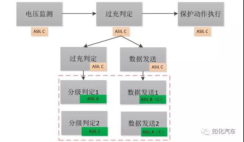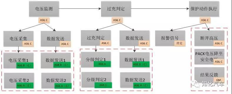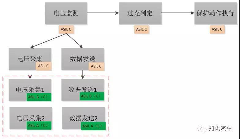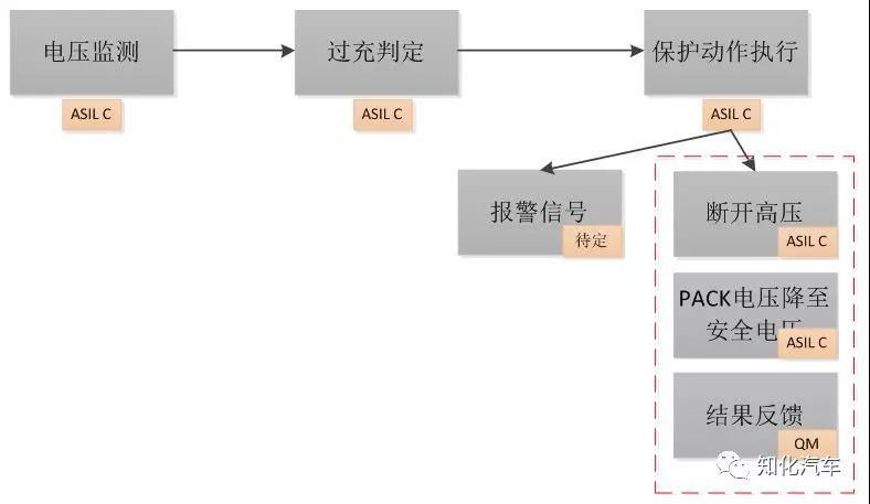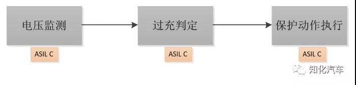 大部分的整車或PACK企業(yè)會(huì)把些功能的實(shí)現(xiàn)在電池包內(nèi)完成,其中,監(jiān)測主要由傳感器實(shí)現(xiàn),過充判定主要由BMS完成,保護(hù)動(dòng)作執(zhí)行主要由繼電器實(shí)現(xiàn)。每一個(gè)功能都繼承了過充ASIL C的屬性,以下分別來看下每個(gè)功能的分析:
