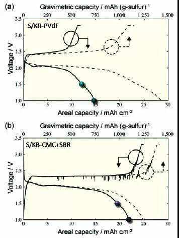 圖16(a)是S/KBPVdF泡沫鋁硫正極的放電曲線,圖16b)是S/KB- CMC+SBR 泡沫鋁硫正極的放電曲線,實(shí)線和虛線分別為面積比容量和克容量。充放電測(cè)試實(shí)驗(yàn)中,截止電壓為1.0——3.3 V,S/KBPVdF 泡沫鋁硫正極的充放電倍率分別為0.03 C 和0.01 C,S/KB- CMC+SBR泡沫鋁硫正極充放電倍率均為0.01 C。