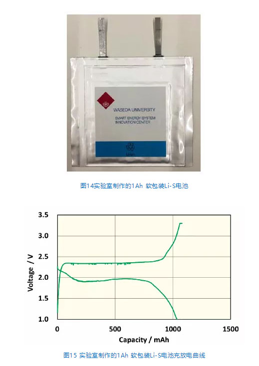 圖14 是實(shí)驗(yàn)室制作的1 Ah 軟包裝Li-S電池,其中硫載量為17.5 mg/cm2。該鋰硫電池由1 mm 厚硫正極和0.2 mm 厚鋰負(fù)極組成,5 Ah 鋰硫電池可通過堆疊幾片這樣的單體電池獲得。圖15 是該電池充放電曲線。