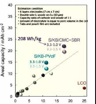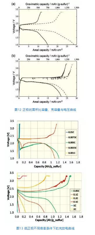 提高硫載量可以提高面積比容量,提高硫的載量面密度,可以獲得高的面積比容量。因電解液保持穩(wěn)定,所以硫具有高的質(zhì)量比能量。優(yōu)化鋰硫電池各部件可以使比能量達(dá)到200Wh/kg。圖11——13是硫正極載量、電壓、克容量、面密度等相互關(guān)系曲線。