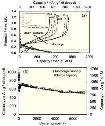 對(duì)實(shí)驗(yàn)制得的Si-O-C負(fù)極進(jìn)行充放電實(shí)驗(yàn),充放電效率達(dá)到98%——99%,放電比容量830 mAh/g,可實(shí)現(xiàn)超過7 000 次循環(huán)。充放電曲線見圖9。