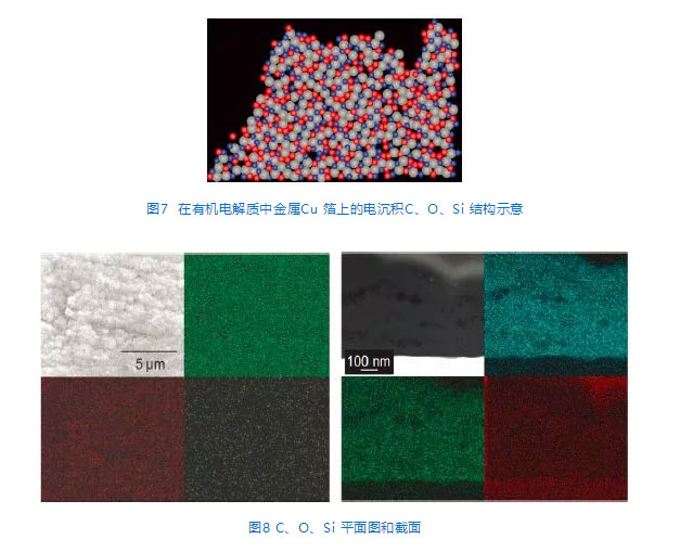 在有機(jī)電解液中電沉積制備負(fù)極示意圖見圖7。用碳酸丙二酯和四氯化硅作溶劑,硅沉積和溶劑分解同時(shí)出現(xiàn),硅和有機(jī)/ 無機(jī)化合物的微復(fù)合,沉積的硅化合物平面圖和截面見圖8,在圖中發(fā)現(xiàn)Si、O、C 在沉積層中均勻分布。