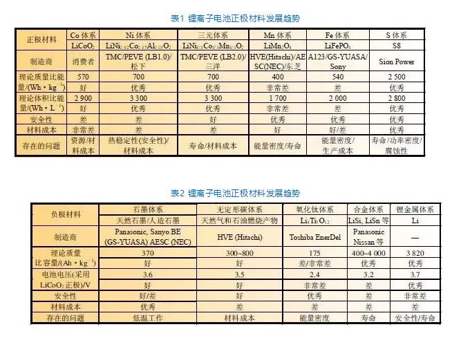 日本近期對(duì)電池正負(fù)極材料的研究越發(fā)重視。表1和表2分別是對(duì)兩種材料發(fā)展趨勢(shì)的歸納。