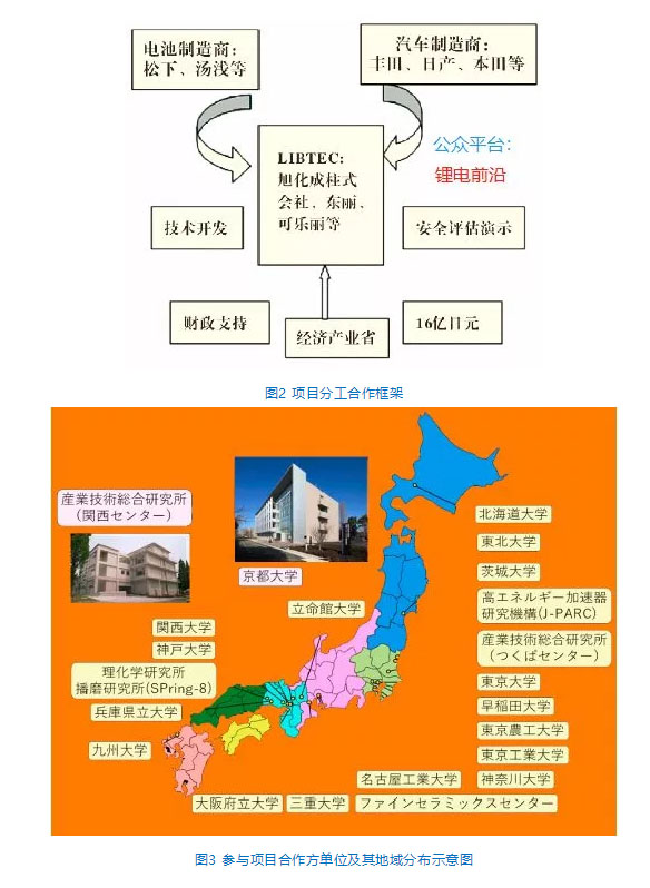 這個(gè)項(xiàng)目旨在推動(dòng)電池提高比能量,延長(zhǎng)新能源汽車?yán)m(xù)航里程。RISING2項(xiàng)目包括鋅空電池、納米界面電池(包括鹵化物及其轉(zhuǎn)化物)等技術(shù)研究。京都大學(xué)研究人員2009—2016年推動(dòng)了RISING項(xiàng)目,主導(dǎo)了6個(gè)創(chuàng)新型電池中的4個(gè)。圖2是圍繞該項(xiàng)目的合作方分工合作框架圖。圖3是參與項(xiàng)目合作方單位及其地域分布示意圖。