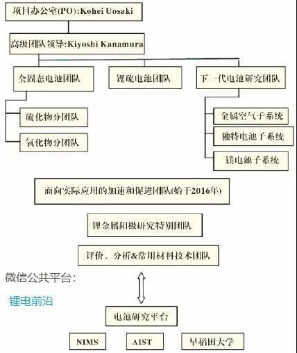 ALCA-SPRING在推動(dòng)研究的過程中,不僅致力于開發(fā)獨(dú)特的材料如活性材料、電解液和隔膜、部件技術(shù)和理解各種類型電池的反應(yīng)機(jī)理,而且在于通過優(yōu)化整個(gè)電池系統(tǒng)來獲得二次電池的最佳性能,ALCA-SPRING研究組織結(jié)構(gòu)見圖1。研發(fā)小組下面還可繼續(xù)細(xì)分為氧化物小組、硫化物小組和全固態(tài)電池小組。在大學(xué)當(dāng)中還有很多次級(jí)研究小組來推動(dòng)AL-CA-SPRING的發(fā)展。
