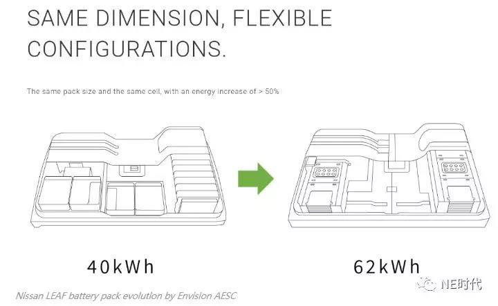AESC上一代動(dòng)力電池是NCM523電池,單體電芯的尺寸是300L*222W*68T,能量密度為224Wh/kg。新一代電池是NCM811電池,尺寸和配置與上一代完全不同。這表明它們不能直接相互替代。