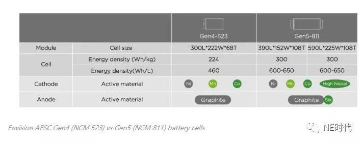遠(yuǎn)景AESC在其官網(wǎng)上發(fā)布了新一代電池的信息。其NCM811電芯有兩個(gè)尺寸,分別為390L*152W*108T和590L*225W*108T。不過兩款電芯的能量密度是相同的,均為300Wh/kg。