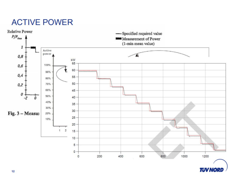 舉個(gè)例子,比如說(shuō)你是頻率過(guò)了到了51.5赫茲,你通過(guò)這個(gè)公式可以計(jì)算出來(lái)德?tīng)査,意思就是說(shuō)功率這塊要改變多少,算出來(lái)大概52%,針對(duì)52%這個(gè)值的要求,會(huì)要求你在2秒之內(nèi)先達(dá)到變化值50%,然后剩下的20秒內(nèi)達(dá)到完完全全的電網(wǎng)需要的功率的變化值。針對(duì)于以前的標(biāo)準(zhǔn)或者說(shuō)廠家的研發(fā)設(shè)計(jì),通常的廠家這的值的變化是用一個(gè)瞬變的方式,就是說(shuō)我前兩面可能是51.5赫茲,我的P可能5%或者10%,下一秒我增加到6.2%,我的廠家可能一下子漸變到62%了,現(xiàn)在德國(guó)電網(wǎng)標(biāo)準(zhǔn)的要求是,我要沿著這條線,就是說(shuō)完全符合這條線的斜率上去,就是說(shuō)我哪怕精確到每1秒或者每1毫秒或者每10毫秒,我都是愛(ài)覆蓋在這條線上面的,而不是說(shuō)一個(gè)瞬變的過(guò)程。