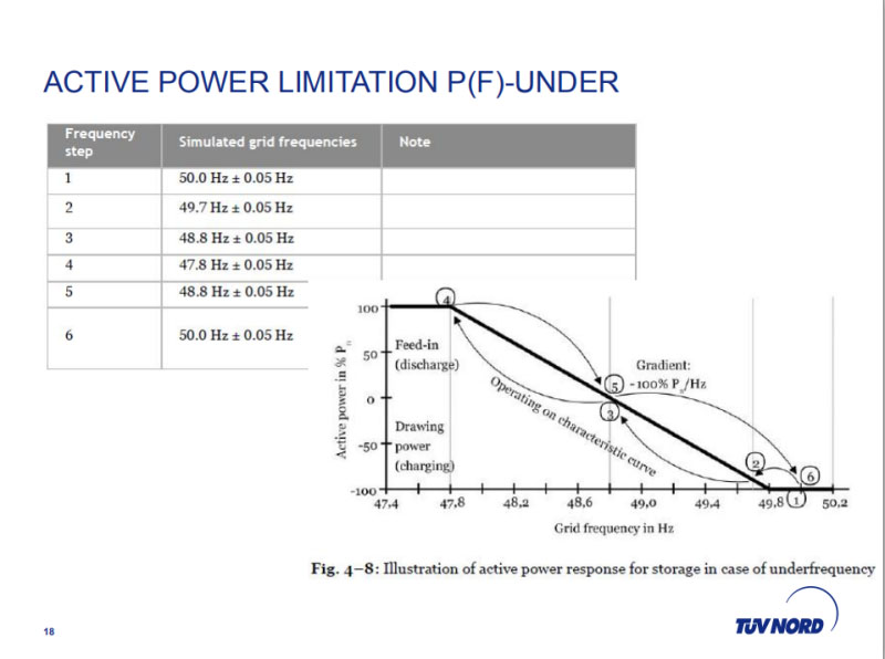 VDE—AR—N 4105,這個(gè)也是新提出的要求,在你的并網(wǎng)點(diǎn)的功率超出去的時(shí)候,你一定要在規(guī)定的時(shí)間內(nèi),3秒的時(shí)間內(nèi),重新恢復(fù)到你的正常的允許范圍,這是對(duì)廠家新提出的要求,對(duì)你的并網(wǎng)點(diǎn)或者說(shuō)公共連接點(diǎn)你的功率恢復(fù)速率的要求。我前面講過(guò)了,因?yàn)槭堑抡Z(yǔ)的,我直接用口述的方式告訴大家,Type 2的儲(chǔ)能變流器或者光伏逆變器,它的功率因素的要求以及大于4.6千伏、KVA小于4.6的不同要求,后面這張表格就可以看出來(lái)了。