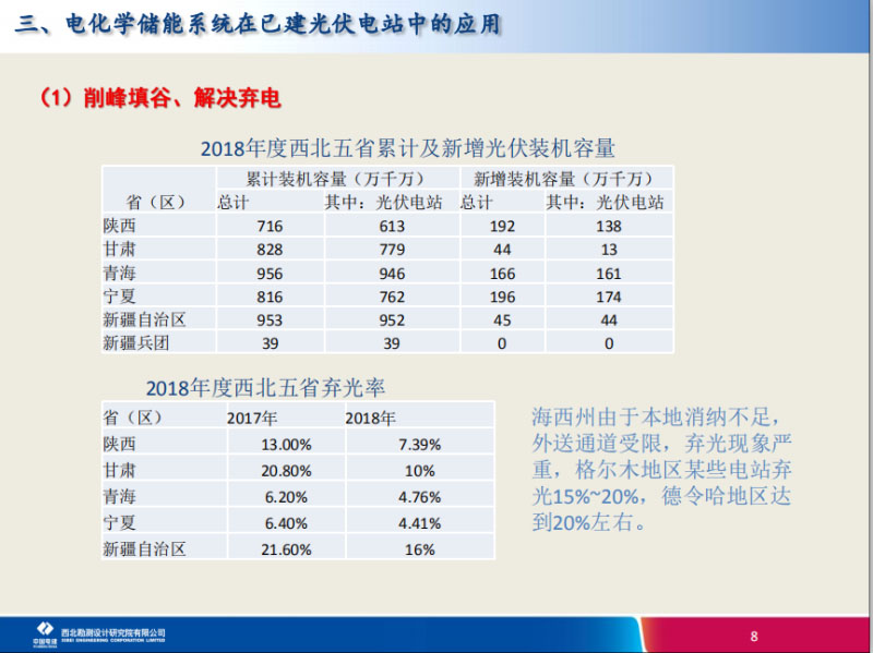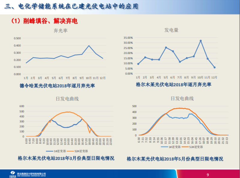 下面介紹一下在電化學(xué)儲能系統(tǒng)在我們已建光伏電站中應(yīng)用的一些可行性,幾個(gè)應(yīng)用場景。1,削峰填谷,解決棄電。我們都知道西北五省是我們最早規(guī)?;_發(fā)光伏電站的廠區(qū),對于早期建設(shè)的光伏電站來說投資成本比較高、電價(jià)比較高,如果在比較嚴(yán)重的棄光條件下,電站的收益是難以保證的。以青海為例,雖然全省2017年、2018連棄光率從6.2%下降到了4.76,但是在局部地區(qū),比如海西州,由于本地消納不足、外地輸送受阻是比較嚴(yán)重的,據(jù)我們了解格爾木某些電站去年棄光達(dá)到了15—20%,而德爾哈地區(qū)甚至超過了20%。這是德令哈、格爾木在2018年全年逐月的棄光率,圖里面可以看得出來,棄光是比較嚴(yán)重的,基本上15%,10%以上,甚至到了30%。