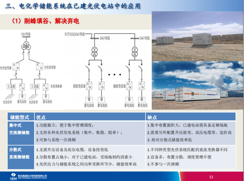 在已建的光伏電站中,增設(shè)儲能系統(tǒng),我們主要有兩種方案,一種是集中式布置,一種是分散式布置。我們上面這兩張圖可以看出來,對于分散式布置來說,就是將儲能系統(tǒng)分散式布置在我們各個(gè)光伏子陣中,蓄電池通過直流變換器之后直接接入光伏逆變器的直流側(cè),實(shí)現(xiàn)直流側(cè)的儲能。而集中式就是,儲能電池是經(jīng)過儲能變流器以后,再經(jīng)升壓變壓器升壓之后接到我們光伏電站的升壓站或者開關(guān)站的中壓母線上。這兩種儲能方式也各有優(yōu)缺點(diǎn)的,集中式儲能,由于儲能系統(tǒng)和光伏發(fā)電系統(tǒng)是相互比較獨(dú)立的,所以比較便于集中管理調(diào)度,而不受光伏發(fā)電系統(tǒng)逆變器選型的限制的。集中式布置,還可以參與系統(tǒng)的一次調(diào)頻。分散式直流儲能,由于不需要經(jīng)過升壓變壓器以及高壓電纜的,所以設(shè)備投資相對低一些,而且由于分散式儲能是布置在每個(gè)子方陣中的,容量比較小,對于已建光伏電站可以布置在原有的逆變器室附近,不受場地制約。另外,由于光伏出力和儲能系統(tǒng)之間直流變換功率環(huán)節(jié)是比較小的,所以儲能系統(tǒng)效率相對要高一些。集中式交流儲能相對而言缺點(diǎn)就是,要集中布置,對于已建光伏電站來說可能要受場地的限制,它的設(shè)備投資可能相對會高一些。相對于分散式儲能來說,因?yàn)橐嘟?jīng)歷一級逆變和升壓的環(huán)節(jié),系統(tǒng)效率相對低一些。而分散式儲能,由于它是在直流側(cè)來儲能,就要跟原有的光伏逆變器進(jìn)行匹配,所以對直流變換器的要求比較多一些。設(shè)備布置比較分散,設(shè)備數(shù)量比較多,調(diào)度管理是不方便的。將來參與一次調(diào)頻的控制策略是比較復(fù)雜的,所以也是不建議它作為一次調(diào)頻系統(tǒng)來使用。