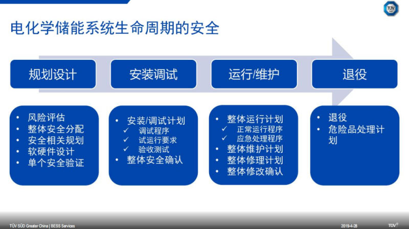 儲(chǔ)能系統(tǒng)風(fēng)險(xiǎn)管理應(yīng)該在全生命周期管控,而不是說(shuō)我安裝完一后管控他它的風(fēng)險(xiǎn)。風(fēng)險(xiǎn)包括規(guī)劃設(shè)計(jì)階段,比如說(shuō)規(guī)劃設(shè)計(jì)階段我的設(shè)備制造商要去做本身產(chǎn)品的風(fēng)險(xiǎn)評(píng)估,我要知道哪些風(fēng)險(xiǎn)會(huì)存在,比如我過(guò)充、過(guò)放、過(guò)溫的時(shí)候我的產(chǎn)品風(fēng)險(xiǎn)來(lái)源是什么、我的風(fēng)險(xiǎn)概率是多少、我造成的后果有多大,比如風(fēng)險(xiǎn)出來(lái)了,我要做整體安全的分配。還有安全相關(guān)的規(guī)劃,比如每個(gè)器件、每個(gè)子系統(tǒng)怎么去規(guī)劃的,還有軟硬件實(shí)際的設(shè)計(jì),設(shè)計(jì)完之后對(duì)單個(gè)功能或者單個(gè)安全的認(rèn)證。安裝調(diào)試階段,包括我們要編制一些安裝調(diào)試計(jì)劃來(lái)保證我們系統(tǒng)的安全調(diào)試或者安全運(yùn)行,包括調(diào)試程序,還有試運(yùn)行的一些要求、驗(yàn)收的一些措施。安裝完之后對(duì)整體安全確認(rèn)的過(guò)程。運(yùn)行、維護(hù)階段,運(yùn)行之后5年、10年有一個(gè)整體運(yùn)行計(jì)劃的編制,比如他的正常運(yùn)行的程序,還有應(yīng)急處理這些程序,還有整體的一些維護(hù)計(jì)劃、整體的優(yōu)秀計(jì)劃,整體修改的確認(rèn)。退役階段,包括它的電池如何去做退役,還有危險(xiǎn)品的處理計(jì)劃。