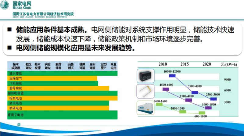 儲(chǔ)能為什么在這個(gè)時(shí)間點(diǎn)開始推廣應(yīng)用?儲(chǔ)能發(fā)展了很多年,從2010年之前就開始在研究。但實(shí)際上,最關(guān)鍵的成本問題,儲(chǔ)能要在電力系統(tǒng)里應(yīng)用的問題,成本只有低到了一定階段才具備商業(yè)化的可能,電網(wǎng)里面用的時(shí)候也是一樣的,在這樣的背景下他能否替代我們傳統(tǒng)的一些電力設(shè)施來保證和優(yōu)化我們電網(wǎng)的發(fā)展,儲(chǔ)能的成本下降給我們在電網(wǎng)側(cè)的應(yīng)用創(chuàng)造了條件。從產(chǎn)業(yè)鏈來講,無關(guān)是從國家五部委還是江蘇省能源局,其實(shí)都有產(chǎn)業(yè)推動(dòng)的一些需要,也印發(fā)了大量的政策措施來推動(dòng),主要標(biāo)志還是2017年國家能源局的文件推動(dòng)。從江蘇電力公司來講,從我們建設(shè)電網(wǎng)主要是服務(wù)于電網(wǎng)安全,目前我們已經(jīng)做了一個(gè)大規(guī)模源、網(wǎng)、荷的友好互動(dòng)系統(tǒng),但是友好互動(dòng)系統(tǒng)的資源在哪里?以前我們在用戶上面去找,這個(gè)經(jīng)濟(jì)可用的用戶側(cè)資源其實(shí)是有限的,而且比較分散,在此基礎(chǔ)之上需要通過儲(chǔ)能來對可調(diào)控資源進(jìn)行補(bǔ)充。通過儲(chǔ)能的應(yīng)用,可以提升我們電網(wǎng)的瞬時(shí)、短時(shí)和時(shí)段三個(gè)能力,來提高電力系統(tǒng)的安全水平。同時(shí),為推動(dòng)儲(chǔ)能的應(yīng)用,江蘇公司內(nèi)部充分調(diào)動(dòng)資源,協(xié)調(diào)公司相關(guān)部門按照職責(zé)分工都來參與儲(chǔ)能應(yīng)用的研究。