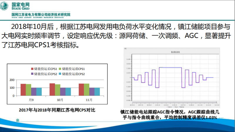 夏季高峰以后,其他的時(shí)段怎么運(yùn)行呢。電網(wǎng)側(cè)儲(chǔ)能的運(yùn)行設(shè)了優(yōu)先級(jí),第一級(jí),就是前面介紹過的,納入到源、網(wǎng)、荷、儲(chǔ)事故應(yīng)急響應(yīng),這個(gè)是最快的,也是優(yōu)先級(jí)最高的。第二級(jí),就是一次調(diào)頻,就是說電網(wǎng)在響應(yīng)頻率下降的時(shí)候,電網(wǎng)本身的一次調(diào)頻能力不足,通過儲(chǔ)能電站來響應(yīng)一次調(diào)頻的功能,這個(gè)作用對電網(wǎng)的支撐是非常有效的。在之后才是納入我們的AGC,通過儲(chǔ)能電站參與電網(wǎng)的頻率調(diào)節(jié)以后,讓他響應(yīng)ACE的信號(hào)進(jìn)行控制,對我們CPS指標(biāo)的考核其實(shí)是非常有好處的。下面做了一些CPS指標(biāo)的對比,效果是比較明顯的。