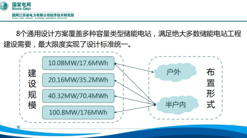 在鎮(zhèn)江儲(chǔ)能電站實(shí)踐的基礎(chǔ)上,通過總結(jié)在調(diào)試、運(yùn)行階段存在的問題,提出了優(yōu)化方案。編制《儲(chǔ)能電站關(guān)鍵設(shè)備技術(shù)規(guī)范》,這個(gè)《規(guī)范》就是針對一些關(guān)鍵設(shè)備,主要是變流器、儲(chǔ)能電池、監(jiān)控系統(tǒng)等等進(jìn)行規(guī)范,確保儲(chǔ)能電站與電網(wǎng)協(xié)調(diào)運(yùn)行。還編制了《江蘇省電網(wǎng)儲(chǔ)能電站模塊化典型設(shè)計(jì)方案》,希望通過模塊化的設(shè)計(jì),在新的儲(chǔ)能電站可以更簡單、快速的應(yīng)用。對電站進(jìn)行優(yōu)化升級(jí),主要提升三個(gè)方面:綜合性能、選型標(biāo)準(zhǔn)、優(yōu)化設(shè)計(jì)。編制的技術(shù)規(guī)范書,通過了外部專家評(píng)審,典型方案則根據(jù)工程規(guī)模、應(yīng)用形式,分別設(shè)計(jì)典型應(yīng)用方案。典型設(shè)計(jì)包括了八個(gè)方案,按照儲(chǔ)能電站功率包括了1萬、2萬、4萬和10萬千瓦,配電裝置形式有戶外的、有半戶內(nèi)的,設(shè)置這樣的模塊基本上能夠滿足大部分工程建設(shè)的需要。