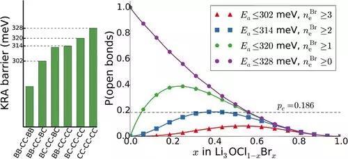 該課題組采用改進(jìn)的方法,將鍵價(jià)參數(shù)用 Morse勢(shì)與靜電庫(kù)侖勢(shì)表示,得到使離子通道連 通的活化能,與密度泛函理論(density functional theory, DFT)計(jì)算值比較(見(jiàn)上圖)。