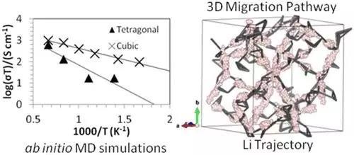 Stefan Adams和Khang Hoang分別以L(fǎng)i7La3Zr2O12 為例,利用鍵價(jià)方法、分子動(dòng)力學(xué)和 第一性原理計(jì)算等方法,研究其鋰離子分布以及溫度相關(guān)的相變。實(shí)驗(yàn)表明Li含量在6.5左右時(shí) 四方相—立方相轉(zhuǎn)變溫度較低,且室溫電導(dǎo)率可高達(dá)10-3 S/cm。