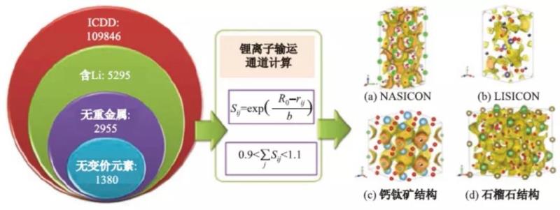 中國(guó)科學(xué)院物理研究所陳立泉院士課題組從國(guó)際衍射數(shù)據(jù)中心 (International Centre for Diffraction Data, ICDD) 數(shù)據(jù)庫(kù)中獲得材料的結(jié)構(gòu)數(shù)據(jù),從中提取含鋰、無(wú)重金屬、無(wú)變價(jià)元素的材料作為備選數(shù)據(jù)庫(kù)利用BVM計(jì)算其離子通道。
