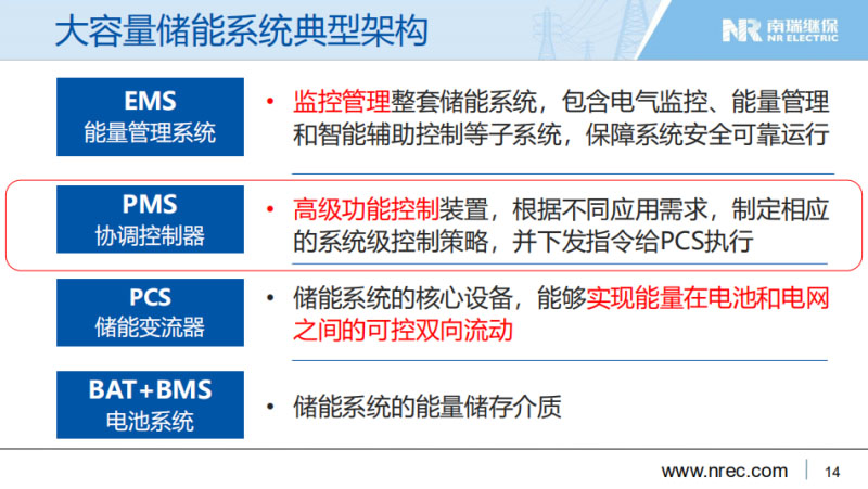 有了變流器控制策略以后,把它用到大容量?jī)?chǔ)能系統(tǒng)里面,儲(chǔ)能系統(tǒng)有哪些控制模式呢?第一,以一次調(diào)頻一次調(diào)壓模式運(yùn)行是可以的。還有二次調(diào)頻二次調(diào)壓,就是PQ模式。離網(wǎng)的時(shí)候可以恒頻恒壓,還有可以PQ模式。作為一個(gè)儲(chǔ)能系統(tǒng),頂層是EMS加PMS,功能強(qiáng)大,系統(tǒng)就很好。大容量?jī)?chǔ)能系統(tǒng)比如100MW系統(tǒng),按目前的一個(gè)PCS功率500KW考慮,就要兩百臺(tái)的PCS。并網(wǎng)運(yùn)行如果參與電網(wǎng)的調(diào)節(jié),需要大家行為一致,才能對(duì)系統(tǒng)做最好的貢獻(xiàn),但要求200臺(tái)PCS行為一致是不可能的,個(gè)體存在的微小偏差,在動(dòng)態(tài)過(guò)程中相互作用,可能會(huì)放大并對(duì)最終結(jié)果產(chǎn)生較大影響,甚至不能達(dá)到系統(tǒng)控制的要求。我們的解決方案是在PCS之上增加一個(gè)控制設(shè)備,叫PMS協(xié)調(diào)控制器。協(xié)調(diào)控制器可以根據(jù)需要配置多臺(tái),形成中間控制層,這就構(gòu)成了一個(gè)EMS+PMS+PCS的三層次控制管理架構(gòu)。有什么好處呢?高級(jí)控制功能可以放在中間層來(lái)做,根據(jù)不同應(yīng)用要求可以定制系統(tǒng)控制策略。中間層根據(jù)高級(jí)應(yīng)用策略進(jìn)行控制計(jì)算,計(jì)算結(jié)果出來(lái)之后平均分給各個(gè)PCS執(zhí)行。這樣PCS的輸出一致性就會(huì)非常好,不會(huì)有很多偏差,總的控制效果就會(huì)很好。