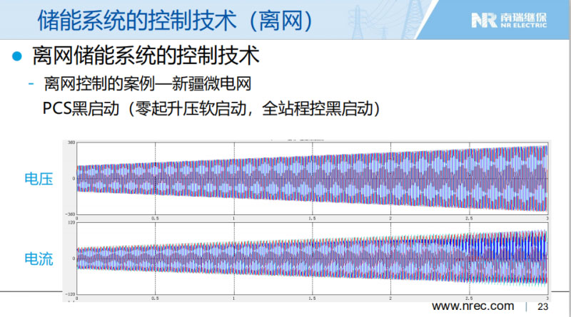 離網(wǎng)方面,儲(chǔ)能系統(tǒng)作用更大。在離網(wǎng)模式下,整個(gè)系統(tǒng)慣量比較小,常常用虛擬同步機(jī)模式運(yùn)行,也可以V/F模式運(yùn)行。離網(wǎng)儲(chǔ)能系統(tǒng)的控制,實(shí)現(xiàn)離網(wǎng)系統(tǒng)多VSG并聯(lián)穩(wěn)定運(yùn)行的技術(shù)。我們提出一些自有的技術(shù),比如說(shuō)自校正的轉(zhuǎn)子運(yùn)動(dòng)方程優(yōu)化控制等。下面不詳細(xì)講。離網(wǎng)儲(chǔ)能系統(tǒng)也有一個(gè)案例,新疆微電網(wǎng)。我們實(shí)現(xiàn)32臺(tái)PCS虛擬同步機(jī)模式并聯(lián),作為主電源支撐整個(gè)微電網(wǎng)的電壓和頻率穩(wěn)定。左邊是監(jiān)控,中間是現(xiàn)場(chǎng)照片。儲(chǔ)能變流器承受變壓器直接沖擊,系統(tǒng)電壓、頻率平穩(wěn)過(guò)渡。整個(gè)系統(tǒng)黑了以后,實(shí)現(xiàn)自動(dòng)邏輯的PCS黑啟動(dòng)。
