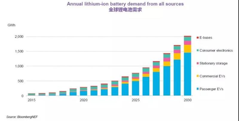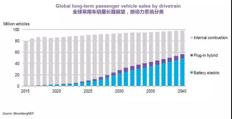 電動汽車的累計銷量將大幅度增長。BNEF預期全球電動乘用車銷量將從2018年的200萬輛上升至2030年的2800萬輛,而到2040年將增長至5600萬輛。