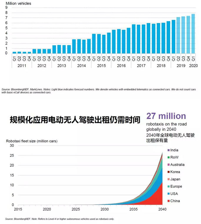BNEF預計自動駕駛要到2030年左右才會對全球交通和能源形態(tài)產(chǎn)生影響。預計到2040年,全球電動無人駕駛出租保有量將達到2700萬輛。