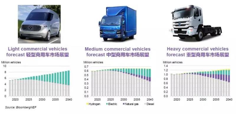 重型卡車是最難以電動化的車型,其電動車銷售占比在2040年僅為19%。電動重卡將主要用于短途場景。但是,傳統(tǒng)的重型長途卡車仍將面臨來自天然氣重卡和氫燃料電池重卡的競爭。