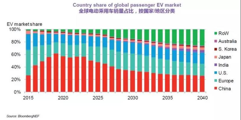中國將繼續(xù)引領全球電動車市場。BNEF預計2025年中國將占全球電動乘用車銷量的48%。到2040年由于其他市場的快速追趕,中國銷量占比將降至26%。
