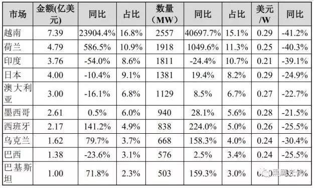 一季度,中國(guó)光伏組件出口前五位市場(chǎng)分別是越南、荷蘭、印度、日本和澳大利亞。