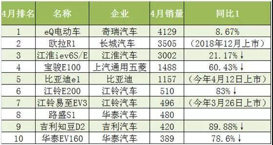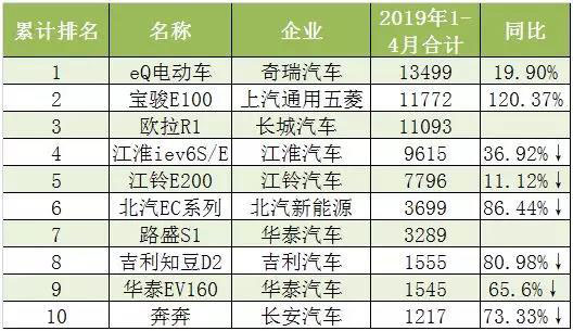 具體來看,奇瑞eQ、寶駿E100較2018年排名更進一步,奇瑞eQ由2018年年度亞軍變成冠軍,寶駿E100則實現(xiàn)了120%的增長,名次也由2018年第六名擠進2019年前4月的亞軍。
