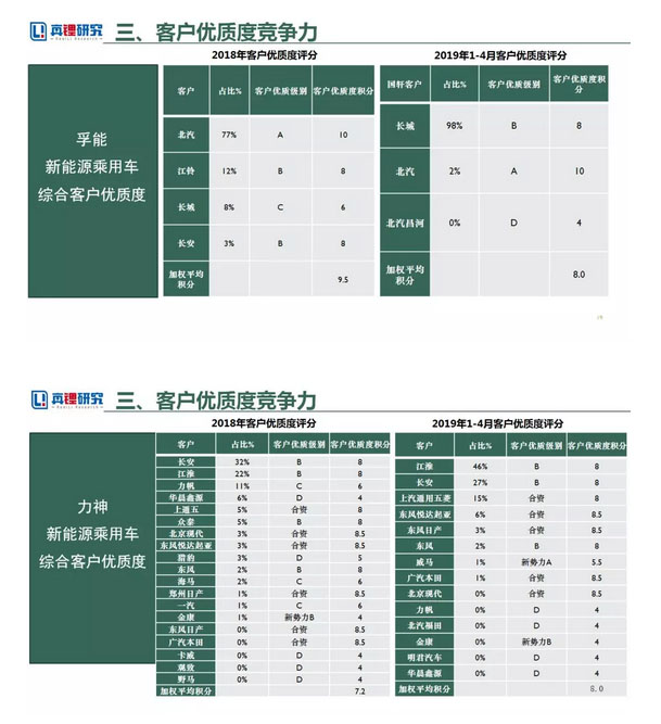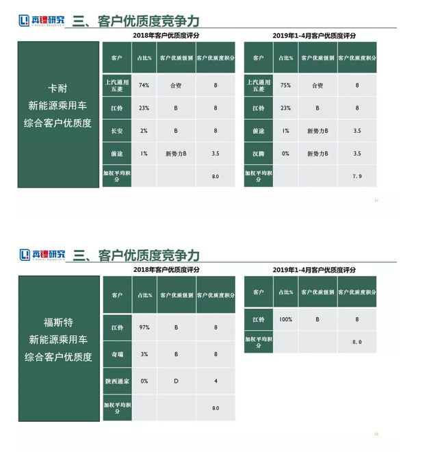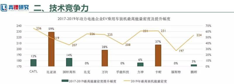 2017年以來補貼和能量密度掛鉤,刺激了企業(yè)的研發(fā)速度。2017-2019年1-4月能量密度提升前三甲分別是比亞迪提升59%,卡耐提升37%,萬向提升28%。