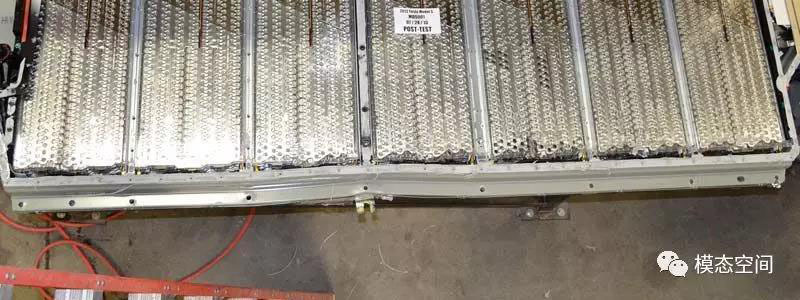 根據(jù)NHTSA公開的Model S柱碰測試報告,剛性柱的最大侵入量達(dá)到200mm,這意味著電池邊框發(fā)生比較大的變形。圖10的柱碰試驗(yàn)照片也顯示碰撞后電池包邊框有永久變形,電池包上殼有明顯的褶皺,電池模組應(yīng)該在碰撞過程中受到過擠壓。