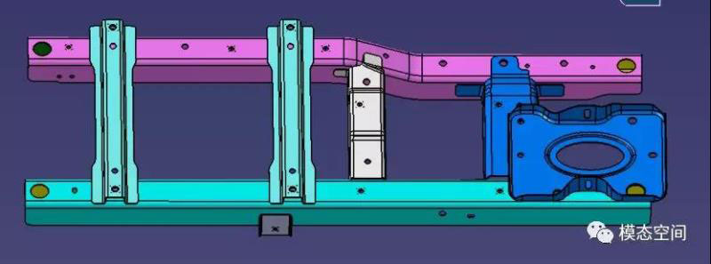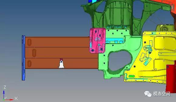 電動車對懸置系統(tǒng)抗扭性能要求更高,所以懸置布置傾向采用質(zhì)心布置方案,懸置支架占用的X向空間偏大,在設(shè)計時要格外注意,盡量將懸置支架設(shè)計的緊湊。圖5展示了一款電動車的前動力總成懸置支架,支架長,前后跨度大,整個懸置系統(tǒng)的抗扭限位能力優(yōu)秀,但這種設(shè)計浪費(fèi)了大量的吸能空間,對碰撞安全不利。