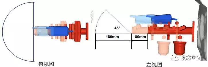 制動主缸是安裝在左側(cè)前壁板上的凸出剛性部件,在碰撞過程中如果受到其它零部件的直接撞擊,將導(dǎo)致前圍板侵入量大幅增加。現(xiàn)在很多中高檔電動車用集成能量回收功能的電制動器(ebooster/ibooster)代替了傳統(tǒng)的制動主缸,其外形更尖銳,結(jié)構(gòu)更加剛硬,受撞擊的后果更為嚴(yán)重。因此我們必須為制動主缸/電制動器預(yù)留出充足空間:制動主缸/電制動器的最前端中心前移80m,以此點(diǎn)為頂點(diǎn),半徑為180mm的半圓錐面內(nèi)不布置其它零部件,如圖4。