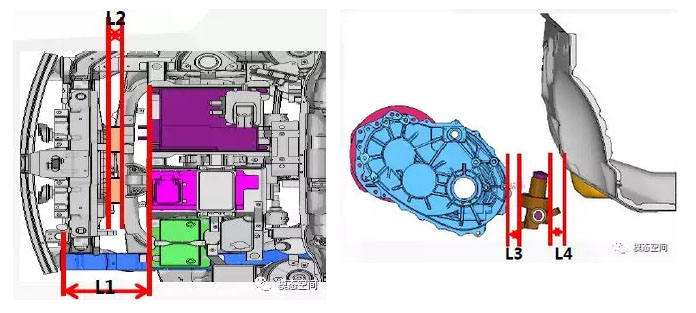 動力電池包后緣位于后扭力梁或者后擺臂之前,推薦距離為90mm。